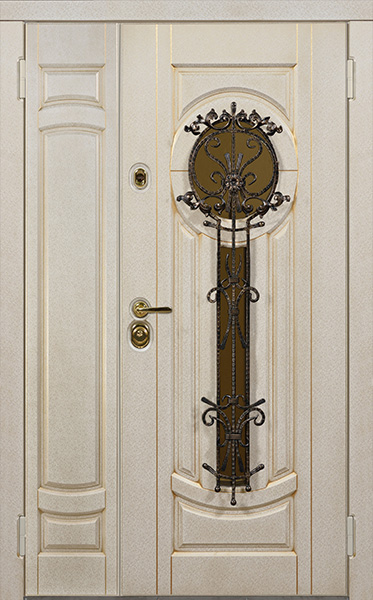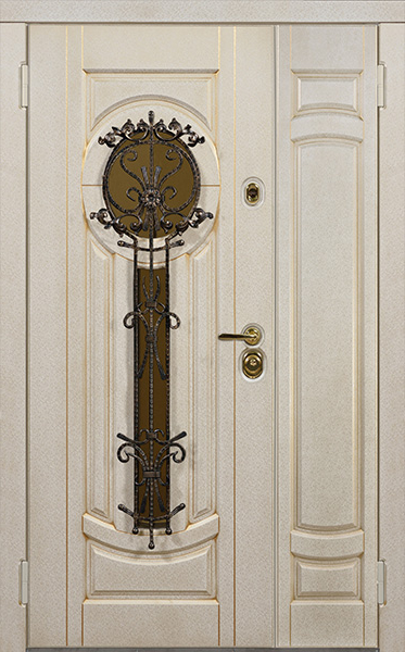 Двухстворчатая парадная дверь с ковкой и стеклом белая №30 — это сочетание красоты и надёжности. Конструкция из профильной трубы 50х25 мм и металлического листа толщиной 2 мм обеспечивает долговечность и стойкость к внешним воздействиям. Элементы ковки придают двери изысканный вид, а стеклопакет позволяет создать атмосферу лёгкости и прозрачности. Внешняя и внутренняя отделка выполнены из плиты МДФ, что делает дверь не только привлекательной, но и устойчивой к механическим повреждениям. Для дополнительной герметичности используются уплотнители с двумя контурами, а блокираторы обеспечат безопасность. Вариативность размеров и возможность добавления дополнительных опций, таких как шумо- и теплоизоляция, делают эту модель универсальной для установки в любом интерьере. Двухстворчатая парадная дверь с ковкой и стеклом белая №30 от производителя: быстрое изготовление и монтаж в Дзержинском, индивидуальные размеры, широкий выбор материалов и фурнитуры, официальная гарантия до 10 лет.