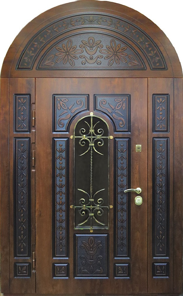 Входная металлическая дверь для частного дома со стеклом и ковкой №29